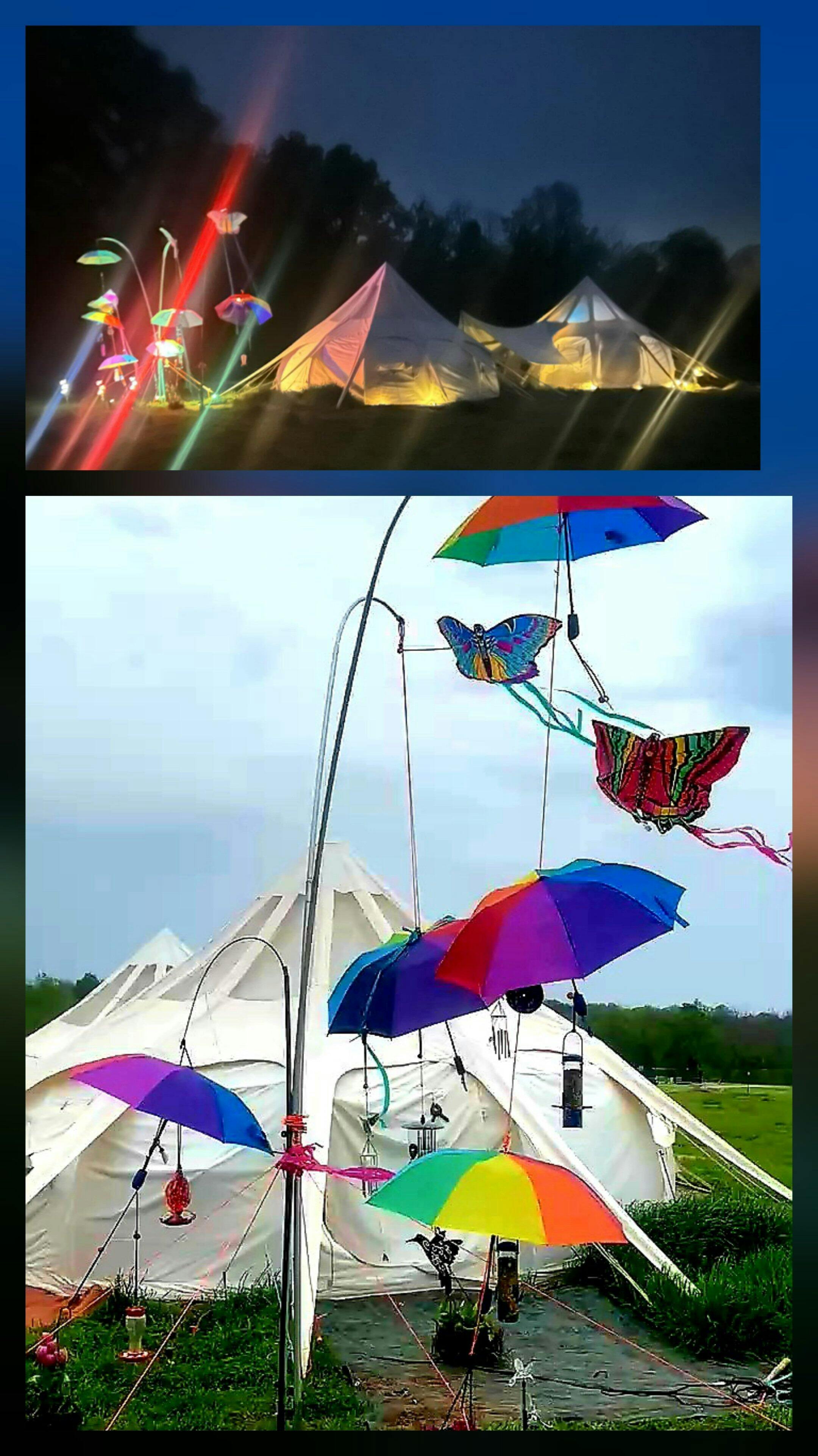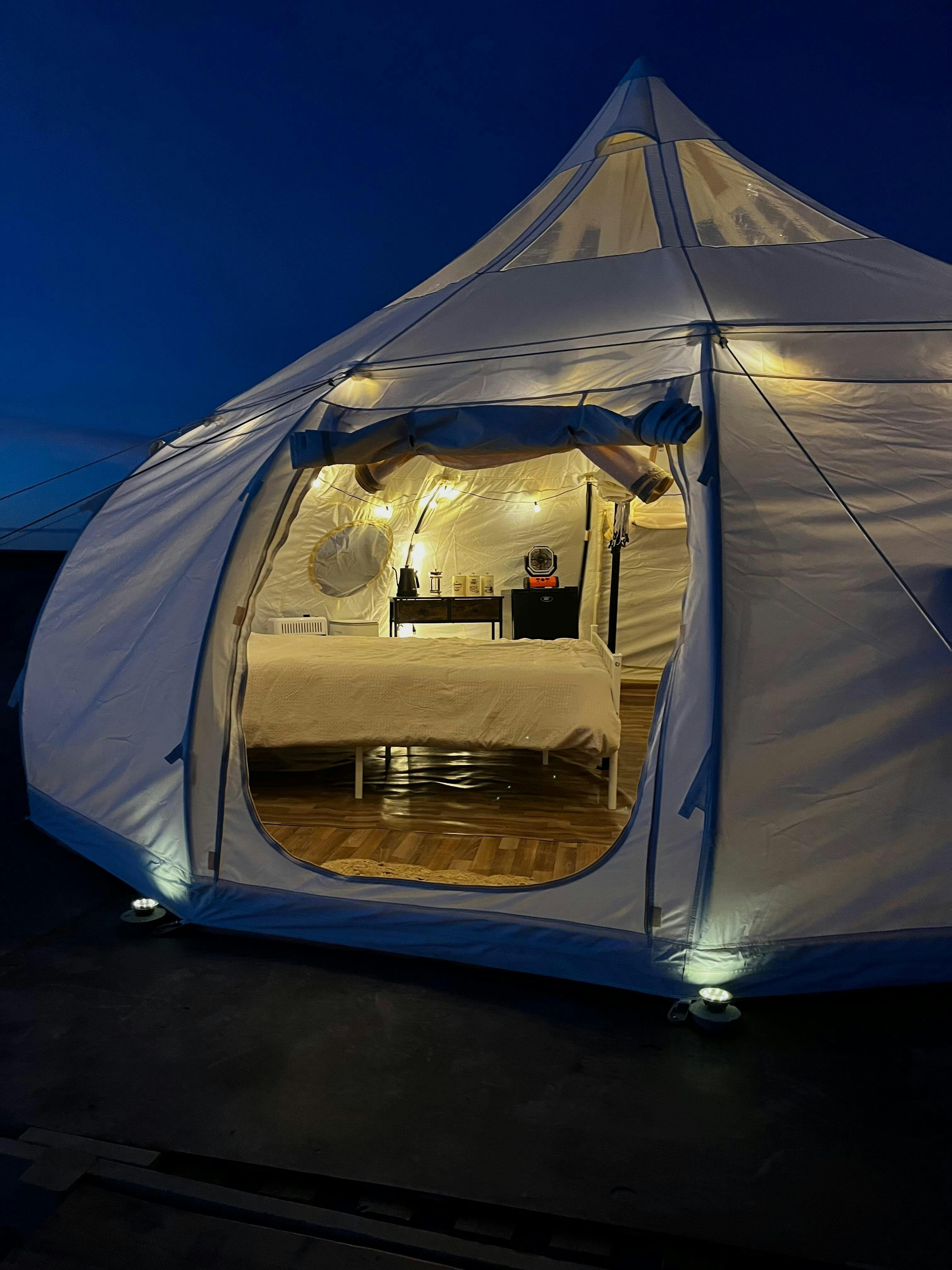 Our guests love the “yurt-style” glamping experience, especially the ability to walk fully around the tents (unlike bell tents), and the interior space is ideal — easily fits two queen beds or a king + futon with room to spare. The 360° windows allow for great airflow, and the clear ceiling panel adds a magical touch that guests rave about.